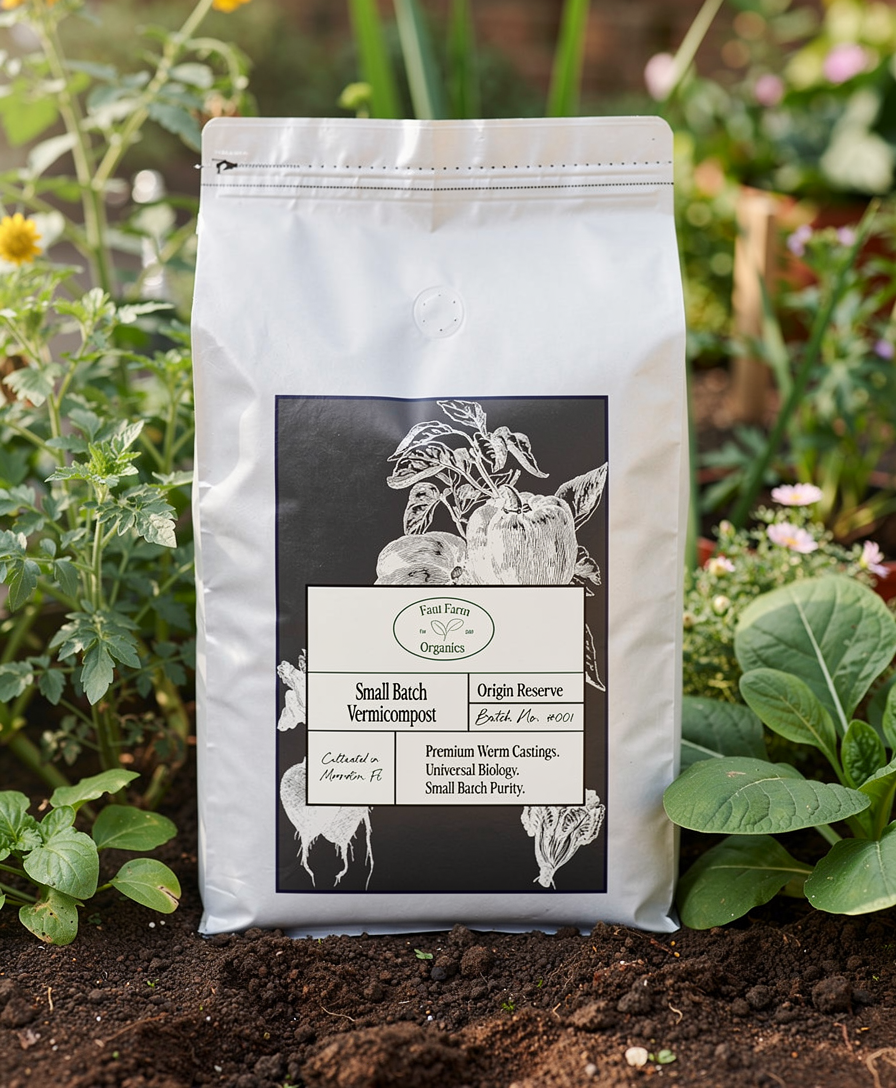 The most concentrated biological soil amendment we produce. Each bag is batch-numbered and packed by hand on our Levy County farm. Origin Reserve is pure vermicompost—rich in beneficial microorganisms, enzymes, humic acids, and plant-available nutrients that improve soil structure, water retention, and plant vitality.